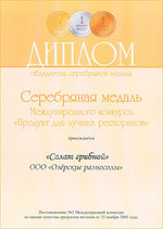 - Diplom und Silbermedaille vom internationallen Wettbewerb "Das Produkt fuer beste Restaurants" fuer Pilz-salat